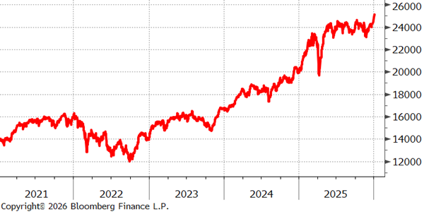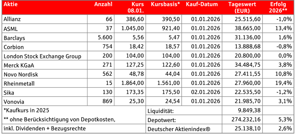 Unbeeindruckt vom US-Angriff auf Venezuela und der Entführung seines Präsidenten zur Strafverfolgung in New York erklommen die großen US-Aktienindizes zu Wochenbeginn neue Rekordstände. Auch der DAX durchbrach am Mittwoch erstmals die Marke von 25.000 Punkten. Einerseits profitierte der deutsche Aktienmarkt dabei von der zuletzt gestiegenen Zuversicht hinsichtlich der stimulierenden Wirkung des Fiskalpakets. Andererseits stützte die Rüstungsbranche den Markt, da sie von den jüngsten geopolitischen Spannungen und Verwerfungen profitierte. Auch Gold, das Synonym des sicheren Hafens an den Finanzmärkten, setzte seinen Aufwärtstrend fort. Mit einer Fülle von Aussagen zu den Themen Öl, Gewinnausschüttungen von Rüstungsunternehmen und Restriktionen für große institutionelle Investoren beim Erwerb von Immobilien versetzte die US-Administration am Mittwoch der positiven Stimmung an den US-Börsen dann aber einen Dämpfer.