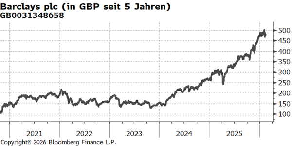 Kepler Cheuvreux (KCH) hat die Erkenntnisse aus der Q4/25-Telefonkonferenz von Barclays (1) zusammengefasst und die Kaufempfehlung für die Aktie bekräftigt. KCH geht dabei insbesondere auf den vom Management vorgestellten mittelfristigen Plan ein. KCH bezeichnet ihn als „einen realistischen Plan mit eingebauten Puffern“. KCH weist insbesondere darauf hin, dass, wenn keine geeigneten Investitionsmöglichkeiten gesehen werden, Mittel an die Aktionäre ausgeschüttet werden sollen. KCH kommt zum Fazit: „Insgesamt begrüßen wir diesen Plan, der Rentabilität (wir haben 14,1% im Jahr 2028, der Konsens liegt bei 13,5%) und Kapitalausschüttungsplus (KECH-Ausschüttung von 17 Mrd. GBP für 2026-2028) beinhaltet. Wir sehen die Reaktion des Aktienkurses als Folge von Top-down-Bedenken (politischer Natur) und betrachten dies als Kaufgelegenheit.“