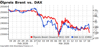 Die Aktienmärkte befinden sich ohne Wenn und Aber im Klammergriff der geopolitischen Turbulenzen und speziell in Abhängigkeit der Energiepreise. Höhere Ölnotierungen sind ceteris paribus inflationsfördernd und wachstumshemmend und bringen die Geldpolitiker in eine unkomfortablere Situation, falls die Auswirkungen des Irankrieges nicht mehr als transitorisch zu beurteilen sind.