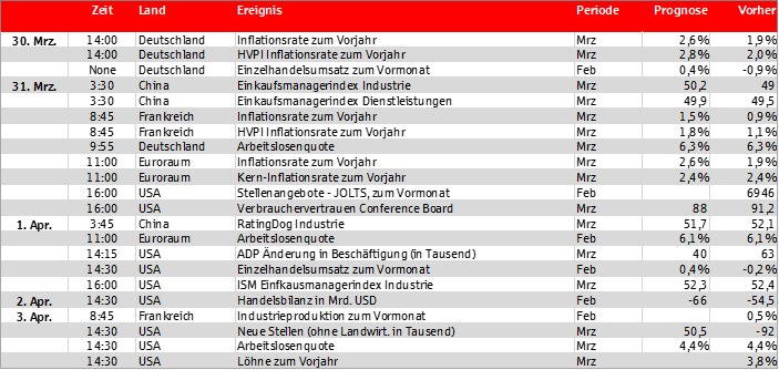 In der kommenden Woche richten sich die Blicke der Marktteilnehmer im Euroraum vor allem auf die Inflationszahlen für den Monat März. In den USA stehen der Arbeitsmarktbericht und die Einzelhandelsdaten im Fokus. Die in der nächsten Woche anstehenden Veröffentlichungen dürften den Notenbanken daher wichtige Einblicke für die weitere Ausgestaltung ihrer Geldpolitik gewähren. Denn wie diese auf ihren Pressekonferenzen in der vergangenen Woche verlautbarten, bleiben die konkreten Auswirkungen des Konflikts auf Konjunktur und Preise schwer abzuschätzen.