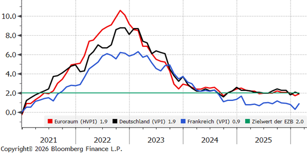Die Inflationsraten im Euroraum bewegten sich im vergangenen Jahr weitgehend stabil auf dem Niveau des 2-Prozent-Inflationsziels der Europäischen Zentralbank (EZB). Die Notenbank blickte inflationsseitig daher relativ zuversichtlich auf das Jahr 2026, doch der Iran-Konflikt hat diesen Ausblick deutlich verschlechtert. Da die Energiepreise Bestandteil des zur Berechnung der Inflationsrate zugrunde liegenden Warenkorbs sind, wird es zu steigenden Inflationsraten kommen. Die große Unbekannte bleibt die Dauer des Konflikts und damit auch die weitere Preisentwicklung bei Öl und Gas. Die kurzfristigen Markterwartungen bezüglich der Inflationsraten sind seit Beginn des Konflikts deutlich angestiegen. In ihrem gestern veröffentlichten Monatsbericht betonte die Bundesbank, dass der Inflationsausblick aktuell besonders unsicher sei. Die Inflationsrate in Deutschland dürfte sich nach dem Bericht der Bundesbank in den kommenden Monaten eher in Richtung 3 Prozent bewegen.