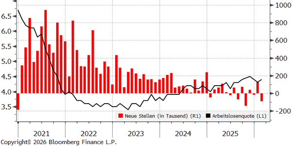 Auch für die Fed bleibt die weitere Entwicklung im Iran-Konflikt eine große Unbekannte. Neben den höheren Energiepreisen blickt die Notenbank zudem besorgt auf die durch Zölle verursachten Preiserhöhungen. Laut ihrem Präsidenten wird die Fed ihre Zinsen unverändert lassen, solange es bei den zollinduzierten Güterpreisanstiegen zu keinen nachhaltigen Preissrückgängen kommt. Sollte sich die Abkühlung am Arbeitsmarkt jedoch fortsetzen, halten wir eine Zinssenkung im weiteren Jahresverlauf für möglich. Auf den überraschend starken Arbeitsmarktbericht für Januar folgte ein überraschend schwacher Bericht für Februar. In ihren auf der März-Sitzung aktualisierten Projektionen hat die Fed die erwartete Arbeitslosenquote für das Jahr 2026 nicht angepasst. Demnach erwartet sie weiterhin eine Stabilisierung der Arbeitslosenquote bei 4,4 Prozent. Allerdings sei die Prognoseunsicherheit laut Notenbankpräsident Jerome Powell extrem hoch.