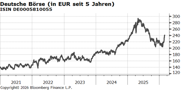 (1) Deutsche Börse-Einzelempfehlung von Kepler Cheuvreux, veröffentlicht am 03.03.2026, Votum: Kaufen, Kursziel 275,00 EUR. Die erstmalige Weitergabe durch die Haspa erfolgte am 04.03.2026 um 11:00 Uhr. Die weiteren gesetzlichen Pflichtangaben finden Sie hier.