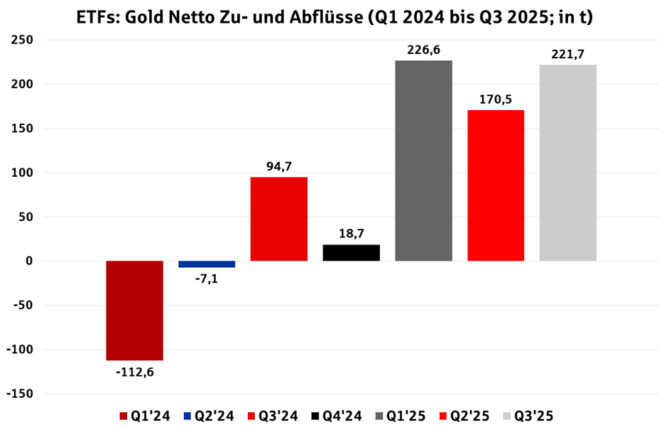 Besonders auffällig war der kräftige Aufbau von Positionen in börsengehandelten Fonds (ETFs), deren Bestände um 222 Tonnen ausgeweitet wurden und damit einen zentralen Beitrag zur Investitionsnachfrage leisteten. Ergänzend dazu sorgte ein vier-tes aufeinanderfolgendes Quartal mit einer Nachfrage nach Barren und Münzen von über 300 Tonnen dafür, dass die gesamte Goldnachfrage weiter deutlich an Stärke gewann. Hinter diesen Zuflüssen steht vor allem das wachsende Interesse institutio-neller Anleger.