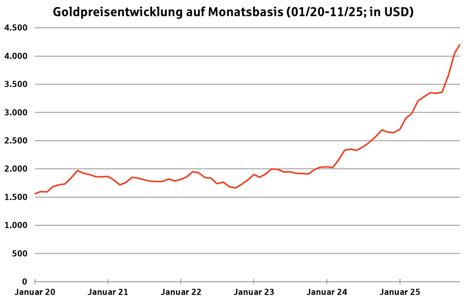 Im Oktober 2025 überschritt der Preis für eine Feinunze erstmals die Marke von 4.000 US-Dollar und erreichte kurzzeitig einen neuen Rekordstand von rund 4.380 US-Dollar.