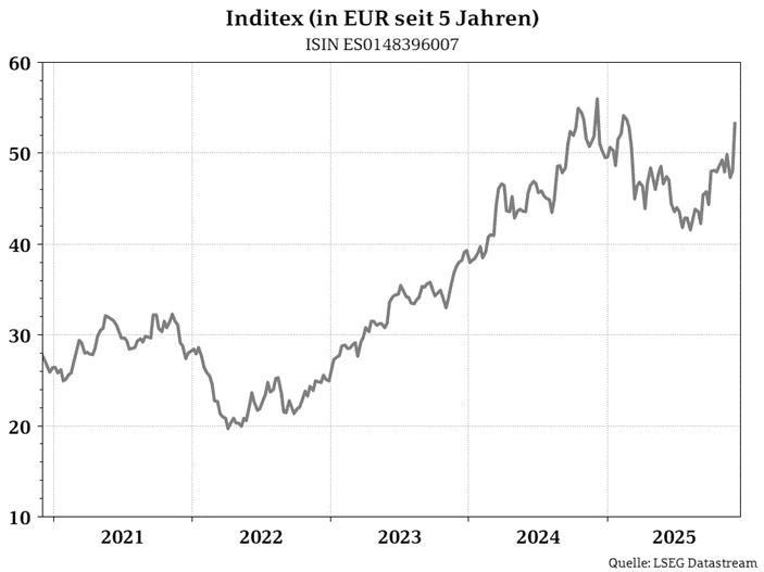 (1) Inditex-Einzelempfehlung von Kepler Cheuvreux, veröffentlicht am 04.12.2025, Votum: Kaufen, Kursziel 57,25 EUR. Die erstmalige Weitergabe durch die Haspa erfolgte am 04.12.2025 um 12:00 Uhr. Die weiteren gesetzlichen Pflichtangaben finden Sie hier.