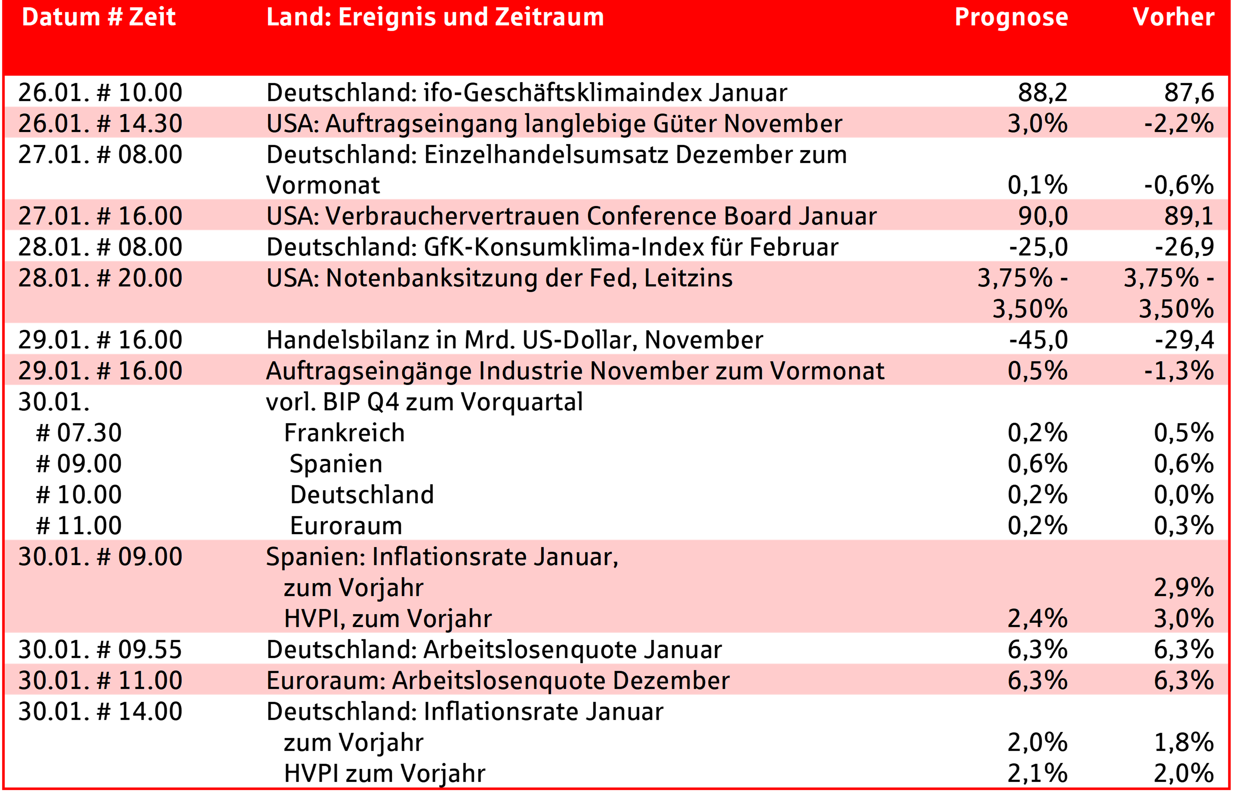 In der kommenden Woche rückt insbesondere die Sitzung der US-Notenbank (Fed) in den Fokus. Von besonderem Interesse ist zudem das Verbrauchervertrauen in den USA. Diesseits des Atlantiks steht die Bekanntgabe der BIP-Wachstumszahlen für das vierte Quartal bevor. In Deutschland stehen neben den Inflationsraten für Januar insbesondere die Veröffentlichung des ifo Geschäftsklimaindex und des GfK-Konsumklima-Index im Fokus.