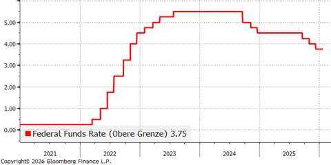Die Leitzinssenkung der Fed auf ihrer Sitzung im Dezember erfolgte inmitten einer durch den US-Shutdown unklaren Datenlage. Inflations- und Arbeitsmarktdaten wurden teilweise gar nicht oder in schlechter Qualität bereitgestellt. Mit dem Shutdown im Rückspiegel ist das Bild nun jedoch klarer. So ist die Arbeitslosenquote zuletzt leicht auf 4,4 Prozent gefallen und die Anzahl der neu geschaffenen Stellen entsprach weitgehend den Erwartungen am Markt. Auch die jüngste Inflationsentwicklung entsprach weitgehend den Konsensschätzungen. Wir und der Markt erwarten, dass es im Januar zu keiner Zinsanpassung kommen wird. Von besonderem Interesse ist die anschließende Pressekonferenz. Neben dem Ausblick der Notenbank könnten hier auch die jüngsten Angriffe der US-Administration auf die Unabhängigkeit der Zentralbank thematisiert werden. So erließ das Justizministerium eine gerichtliche Vorladung gegen Jerome Powell. Gegenstand ist angebliche Falschaussagen im Zusammenhang mit den Kostenüberschreitungen beim Bau bzw. der Renovierung des Notenbankgebäudes. Daraufhin wandte sich der Fed-Chef über soziale Medien an die Öffentlichkeit und machte deutlich, dass er diese Vorwürfe für politisch motiviert hält. Mit Blick auf eine mögliche Entlassung von Lisa Cook, einem Mitglied des Federal Reserve Board, deutete zuletzt vieles darauf hin, dass sich der Oberste Gerichtshof zugunsten von Cook entscheiden könnte. Donald Trump kündigte außerdem an, zeitnah seinen Kandidaten für die Nachfolge von Jerome Powell bekanntzugeben. Powells Amtszeit läuft im Mai 2026 aus.