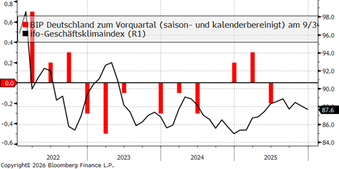 Trotz des starken Gegenwinds aus dem Außenhandel verbesserte sich der ifo-Geschäftsklimaindex im vergangenen Jahr moderat – mit einigen Rücksetzern – von 84,9 Punkten im Dezember 2024 auf jüngst 87,6 Punkte im Dezember 2025. Zuletzt hellte sich das Stimmungsbild in Deutschland etwas auf. Auch bei „härteren” Daten wie der Industrieproduktion oder den Auftragseingängen gab es positive Überraschungen. Insgesamt bleiben die Konjunkturdaten allerdings durchwachsen. Der Blick nach vorne ist durch die erwartbaren wachstumsfördernden Effekte des Fiskalpakets jedoch vorsichtig optimistisch. Nachdem das Jahr 2025 ersten Schätzungen zufolge mit einem leichten Plus beim BIP-Wachstum abgeschlossen wurde, erwarten wir für Deutschland für das Jahr 2026 ein Wachstum von etwa einem Prozent.
