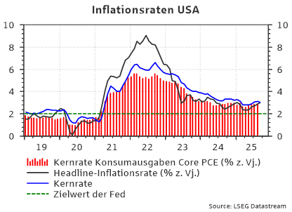 Die Inflation in den USA ist nach der Einführung der Importzölle nicht abrupt nach oben gesprungen, wie es manche ökonomischen Modelle vermuten ließen. Stattdessen dürften die für importierende Unternehmen unweigerlich gestiegenen Kosten nach und nach an die Verbraucher weitergegeben werden. Dieser Prozess wird sich wohl über mehrere Quartale hinwegziehen. Entsprechend verwundert es nicht, dass die Inflation – egal welches Maß man heranzieht – weiterhin auf erhöhtem Niveau verharrt und ihr jeglicher Trend zum Rückgang fehlt. Unter Ökonomen und auch innerhalb der US-Notenbank besteht allerdings Uneinigkeit darüber, ob die Zölle nur einen einmaligen Preisschub erzeugen oder ob es zu Zweitrundeneffekten kommt, die im schlimmsten Fall eine (moderate) Lohn-Preis-Spirale antreiben könnten. Für den September-Wert geht der Konsens von einer Core PCE Rate von 2,8 % aus. Wir können uns sogar 2,9 % vorstellen. Insgesamt erwarten wir, dass die Teuerung nach diesem von der Fed besonders beachteten Inflationsmaß auch im nächsten Jahr bei knapp 3 % verharren wird. Nachdem aber auch der Arbeitsmarkt etwas abkühlt, rechnen wir damit, dass die Fed den Leitzins im Dezember und dann noch einmal Anfang 2026 senken wird. Weitere Schritte danach sind aber derzeit schwer zu rechtfertigen.
