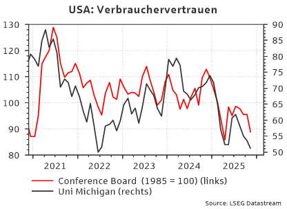 Nach einer kurzen Zwischenerholung im Sommer ist das von der Universität Michigang ermittelte Verbrauchervertrauen wieder auf einem sehr niedrigen Niveau. Mit 51,0 Punkten ist der Stand im November sogar noch unter dem Niveau von April, unmittelbar nach dem „Liberation Day“ und nur knapp über dem Frühjahr 2022, also nach dem Angriff Russlands auf die Ukraine. Im Widerspruch dazu zeigen sich die Einzelhandelsumsätze und der Privatkonsum vergleichsweise stabil. Eine mögliche Erkärung für diese Diskrepanz ist die zunehmende Ungleichheit in den USA, wo die Volkswirtschaft inzwischen als „K-shaped economy“ bezeichnet werden kann. Wohlhabende Konsumenten stellen den nach oben gerichteten Strich im „K“ dar. Sie profitieren von steigenden Aktienkursen („wealth effect“) und zeigen sich einkaufsfreudig. Der ärmere Teil der Bevölkerung wird durch den nach unten gerichteten Strich repräsentiert. Er ist besonders stark von der Inflation betroffen und muss seine Ausgaben auf das Wesentliche reduzieren. Während bei den Stimmungsumfragen jede Stimme gleichgewichtet ist, werden die tatsächlichen Konsumausgaben umsatzgewichtet. Eine andere Erklärung wäre, dass zwar die Stimmung schlecht ist, dies aber schlicht keine Auswirkung auf das tatsächliche Konsumverhalten hat. Eine dritte Möglichkeit ist, dass sich das getrübte Verbrauchervertrauen erst verzögert und langsam in harten ökonomischen Zahlen widerspiegeln wird. Für den Dezember-Wert gehen wir und der Markt von einer leichten Erholung des Index aus.