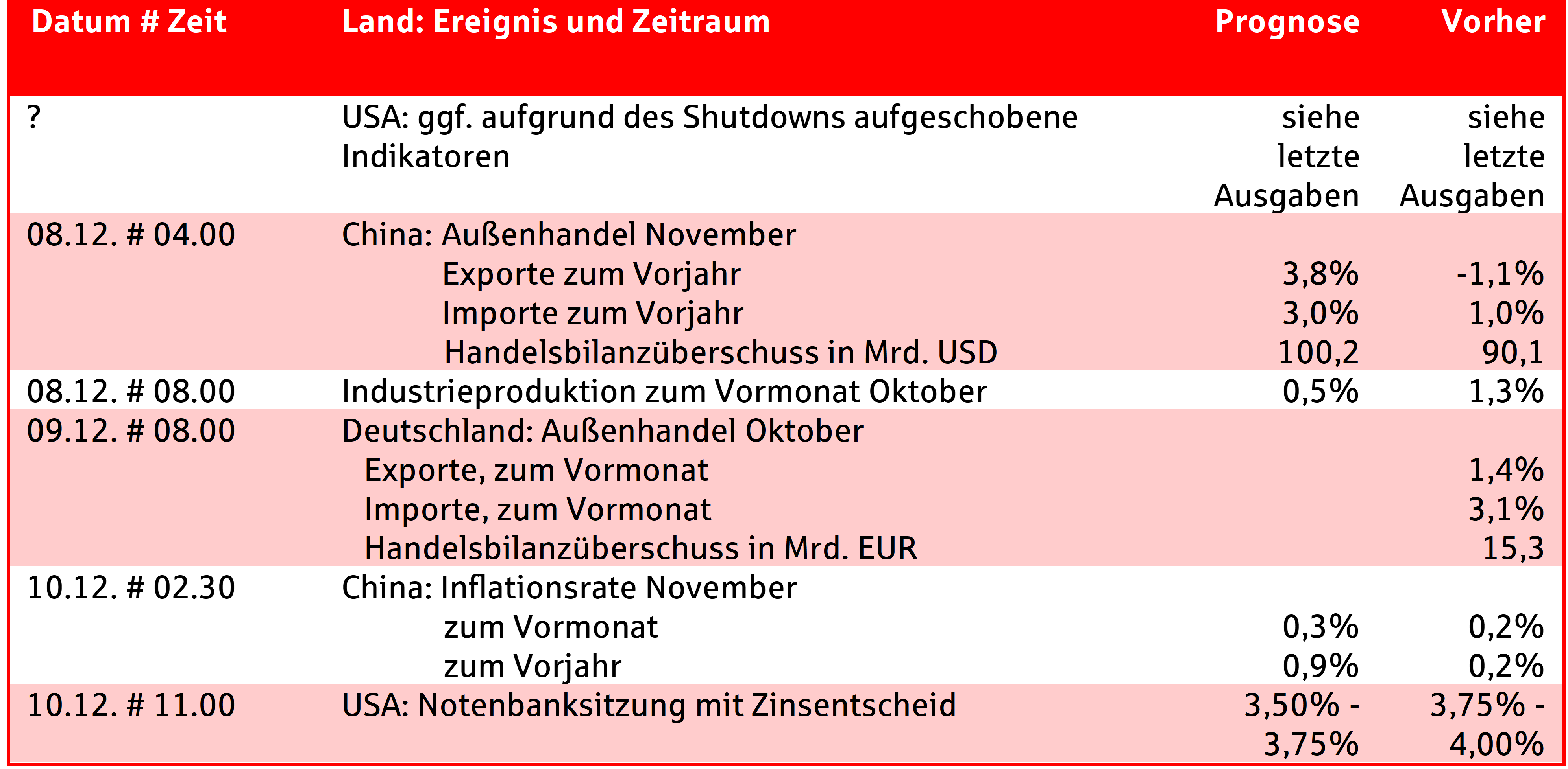 Diese Woche überraschte der Auftragseingang im deutschen Verarbeitenden Gewerbe am Donnerstag positiv. In China fielen die Einkaufsmanagerindizes für November hingegen schlechter aus als vom Markt erwartet. Die Konjunkturdaten aus dem Reich der Mitte bleiben somit weiterhin durchwachsen. In den USA ist der ISM-Einkaufsmanagerindex für Dienstleistungen etwas stärker angestiegen als vom Konsens erwarten wurde. Die ADP-Daten zur Beschäftigungsänderung fielen jedoch unerwartet negativ aus. Insgesamt bleibt die Verfügbarkeit von Daten aus den USA aufgrund des Shutdowns weiterhin eingeschränkt. Die Inflation im Euroraum stieg im November auf Jahresbasis um 0,1 Prozentpunkte auf 2,2 % an und bewegt sich somit weiterhin nah am 2-Prozent-Inflationsziel der Europäischen Zentralbank.