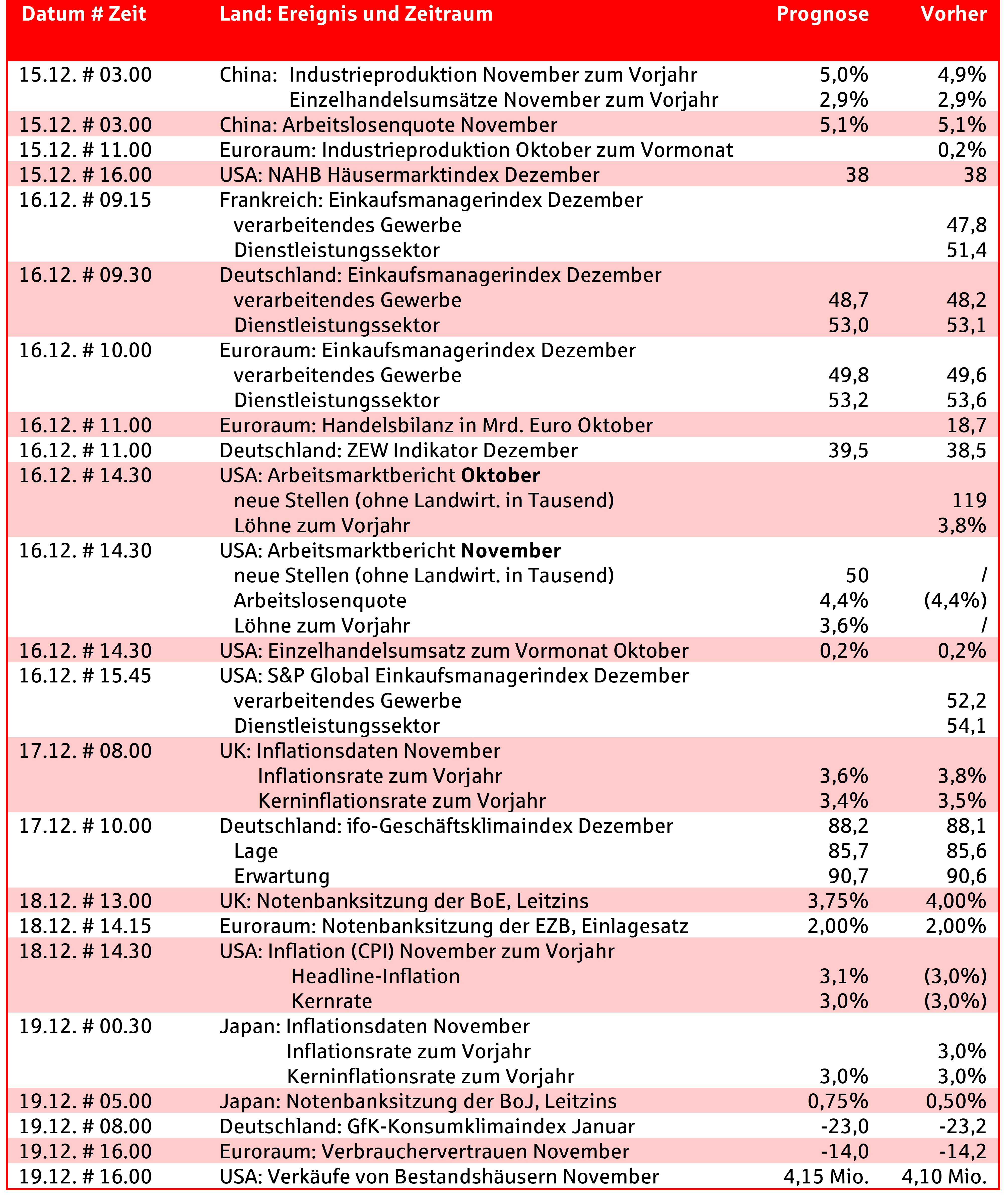 In der kommenden Woche steht eine ganze Batterie an US-Daten zur Veröffentlichung im Kalender, um die Verzögerungen durch den Shutdown aufzuholen (Arbeitsmarkt, Einzelhandelsumsatz, Inflation). Viele davon werden aber unvollständig sein, da einige Datenpunkte schlicht nicht erfasst wurden. Zudem werden einige Stimmungsindikatoren vorgezogen, um nicht in die Weihnachtsfeiertage hineinzulaufen. Im Euroraum sind dies die Einkaufsmanagerindizes und das Verbrauchervertrauen sowie der deutsche ifo Geschäftsklimaindex und der GfK-Konsumklimaindex. Besonders spannend dürfte zudem die Notenbanksitzung in Japan werden. Aktuell stehen die Chancen bei 3:1 für eine Erhöhung von 25 Basispunkten. Noch Anfang letzten Jahres lag der japanische Leitzins im negativen Bereich.