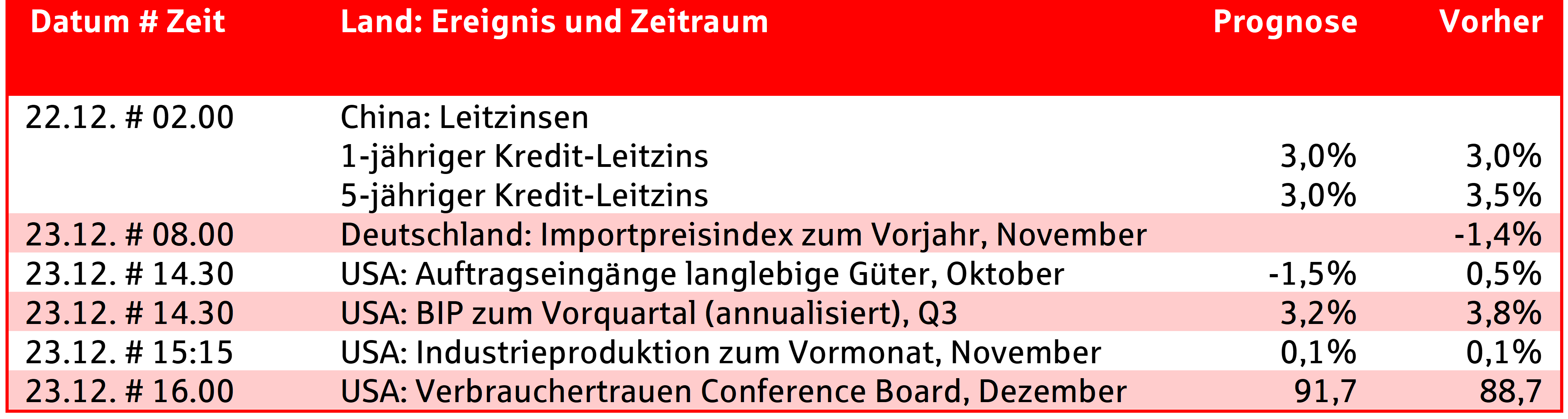 Wie bereits erwähnt, werden aufgrund der Feiertage nächste Woche nur relativ wenige Konjunkturdaten veröffentlicht. Die Leitzinsentscheidungen in China dürften jedoch neue Einblicke in den geldpolitischen Kurs der Notenbank geben. Der Fokus der Börsianer wird jedoch vornehmlich auf den Konjunkturdaten aus den USA liegen.
