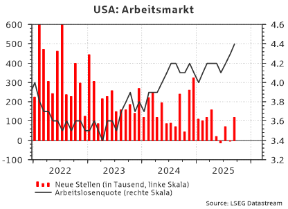 Nach Ende des Shutdowns werden nun die Arbeitsmarktdaten für zwei Monate veröffentlicht. Für Oktober erscheint aber nur die Hälfte der Indikatoren, da die Haushaltsumfragen nicht durchgeführt wurden. Neue Daten sind dringend notwendig, da am Arbeitsmarkt verschiedene Wirkkräfte am Werk sind, die es gilt einzuordnen. Ersten,s ist seit Mitte 2023 eine Abkühlungstendenz erkennbar – trotz starker BIP-Wachstumsraten. Zweitens, wurde der leicht steigenden Arbeitslosenquote bereits mit Leitzinssenkungen begegnet. Ob dies wirkt, ist noch unklar. Drittens, ist die Zahl der im Ausland geborenen Arbeitskräfte seit Trumps Amtsantritt rückläufig, während sie vorher deutlich zulegten. Dadurch könnten weniger neue Stellen notwendig sein, um die Arbeitslosenquote konstant zu halten. Viertens, sind Produktivitätsgewinne durch KI zu erwarten. Auch um zu bewerten, inwieweit diese bereits sichtbar sind und, ob z.B. weniger junge Arbeitskräfte eingestellt werden, sind neue Arbeitsmarktdaten unerlässlich. Entsprechend schwer sind Prognosen zu den kommenden Publikationen und der Konsens setzt auf die Vorhersagen der Vergangenheit: Eine Seitwärtsbewegung bei der Arbeitslosenquote (4,4%) und eine Stellenaufbau-Prognose in gleicher Höhe wie beim letzten Mal (50 Tausend).