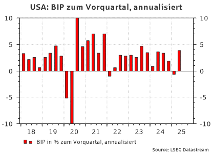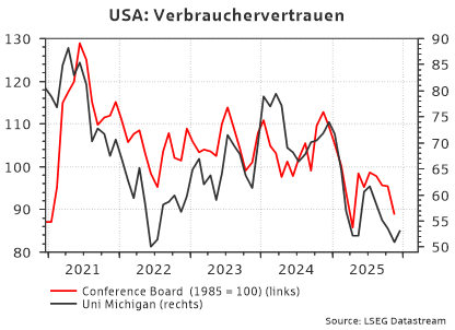 Die Stimmung unter den US-Verbrauchern leidet weiterhin unter Zöllen, hartnäckig hohen Inflationsraten und Sorgen um den eigenen Arbeitsplatz. Hinzu kommt das Problem der ungleichen Wohlstandsverteilung. So ist das reichste Zehntel der Bevölkerung inzwischen für rund die Hälfte des Privatkonsums verantwortlich. Ähnlich wie der Stimmungsindex der Universität Michigan gab auch der vom Conference Board erhobene Index im Jahresverlauf 2025 deutlich nach. Mit dem Shutdown im Rückspiegel und etwas mehr Planungssicherheit hinsichtlich der US-Zölle verbesserte sich der Index der Universität Michigan zuletzt etwas. Der Markt erwartet auch beim Conference Board eine leichte Aufhellung im Dezember.