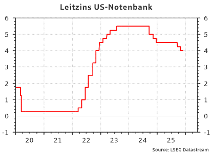 Die US-Notenbank befindet sich hinsichtlich ihres weiteren geldpolitischen Vorgehens in einer herausfordernden Situation. Denn durch einen sich abschwächenden Arbeitsmarkt bei gleichzeitig erhöhter Inflation sind beide ihrer Mandate – Vollbeschäftigung und Preisstabilität – gefährdet. Eine Lagebestimmung wird zudem durch eine verzögerte und teilweise komplett ausbleibende Datenbereitstellung aufgrund des Shutdowns erschwert. Im Gremium, das den Leitzins festlegt, gehen die Ansichten über das weitere geldpolitische Vorgehen zum Teil deutlich auseinander. Nachdem die Wahrscheinlichkeit für eine Senkung im Dezember am Markt deutlich gesunken war, geht die Konsenserwartung – nicht zuletzt vor dem Hintergrund der zuletzt schwächeren Arbeitsmarktdaten und Aussagen von Gremiumsmitgliedern – nun wieder von einer Senkung aus. Auch wir erwarten eine Senkung um 0,25 Prozentpunkte. Sollten die nachträglich bereitgestellten PCE-Inflationsdaten diese Woche jedoch einen stärkeren Anstieg aufweisen, könnte dies die Fed je nach Intensität dazu bewegen, den Leitzins zunächst unverändert zu lassen.