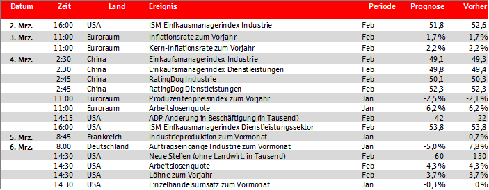 In der kommenden Woche richten die Marktteilnehmer ihren Fokus insbesondere auf den US-Arbeitsmarktbericht und die chinesischen Einkaufsmanagerindizes. Von besonderem Interesse sind zudem die Inflationsraten für den Euroraum. Nach dem starken Anstieg der Auftragseingänge in der deutschen Industrie im Dezember liegt ein besonderes Augenmerk auf der Entwicklung im Januar.