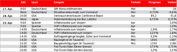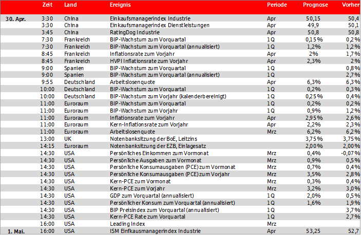 In der kommenden Woche stehen zahlreiche wichtige Veröffentlichungen bevor. Neben den Zinsentscheidungen der großen Notenbanken stehen insbesondere die BIP-Wachstumszahlen im Euroraum im Fokus. In den USA wird darüber hinaus die Kernrate der Konsumausgaben (Core-PCE-Rate) für März veröffentlicht. Von besonderem Interesse sind auch die Inflationsraten für April im Euroraum.