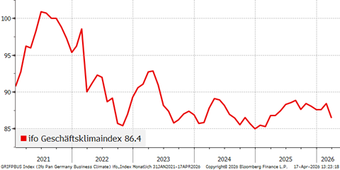 Der ifo Geschäftsklimaindex startete mit 87,6 Punkten schwächer als erwartet ins Jahr 2026. Im Februar erholte er sich jedoch deutlich und erreichte mit 88,6 Punkten den höchsten Stand seit August 2025. Der aufkeimende Optimismus wurde im März zunichte gemacht, als der Index auf 86,4 Punkte abstürzte. Grund hierfür waren der Iran-Krieg und der daraus resultierende Energiepreisschock, der den Hoffnungen auf eine wirtschaftliche Erholung einen deutlichen Dämpfer versetzte.