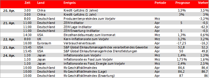 In der kommenden Woche werden wichtige Stimmungsindikatoren aus Deutschland und dem Euroraum erwartet. Darüber hinaus steht eine Leitzinsentscheidung der chinesischen Zentralbank bevor. Von besonderem Interesse sind neben den Inflationsdaten aus Japan auch die Einkaufsmanagerindizes aus den USA.