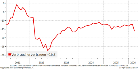 Das Verbrauchervertrauen im Euroraum begann das Jahr 2026 mit einem Wert von -12,4 Punkten im Januar und verbesserte sich im Februar geringfügig auf -12,2 Punkte. Im März kam es jedoch zu einer deutlichen Kehrtwende, als der Krieg im Iran ausbrach und das Verbrauchervertrauen auf -16,3 Punkte abstürzte – eine drastische Verschlechterung um 4,1 Punkte innerhalb eines einzigen Monats. Ausschlaggebend hierfür waren insbesondere die stark gestiegenden Energiepreise und die wachsenden Inflationsängste.