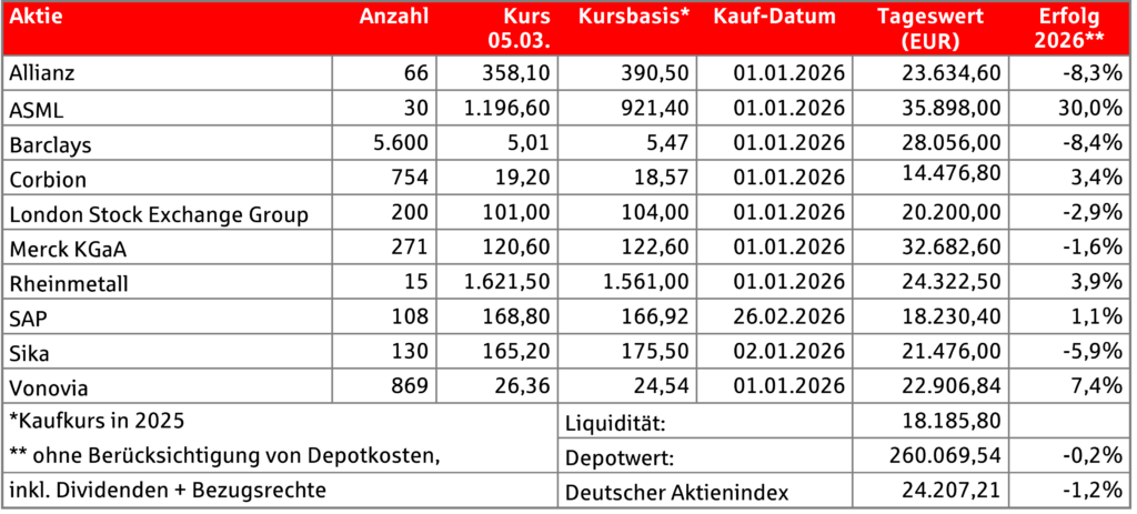 Gegen den Negativtrend konnten sich dabei mit der London Stock Exchange Group und der in der Vorwoche erst neu aufgenommen SAP zwei Titel stemmen, die weit unter ihren Höchstständen aus dem Jahr 2025 notieren.